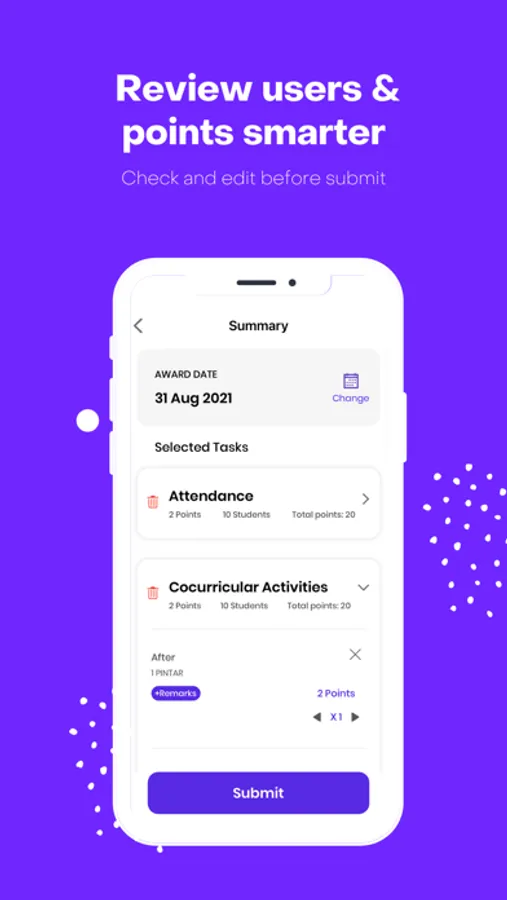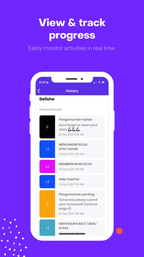 Merits that can be given to students include all positive behavior such as helping teachers, coming early to school, participating in gotong royong, completing homework, reading the Quran and many more. Each school determines its own merits and scores.