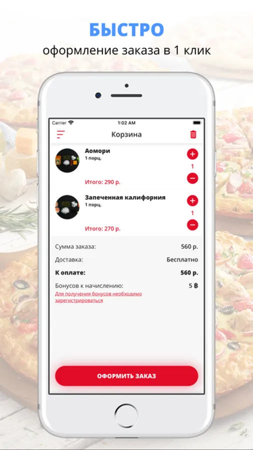 Скачивайте наше приложение, оформляйте заказ и наслаждайтесь любимой едой, где бы Вы ни были! Приятного аппетита!