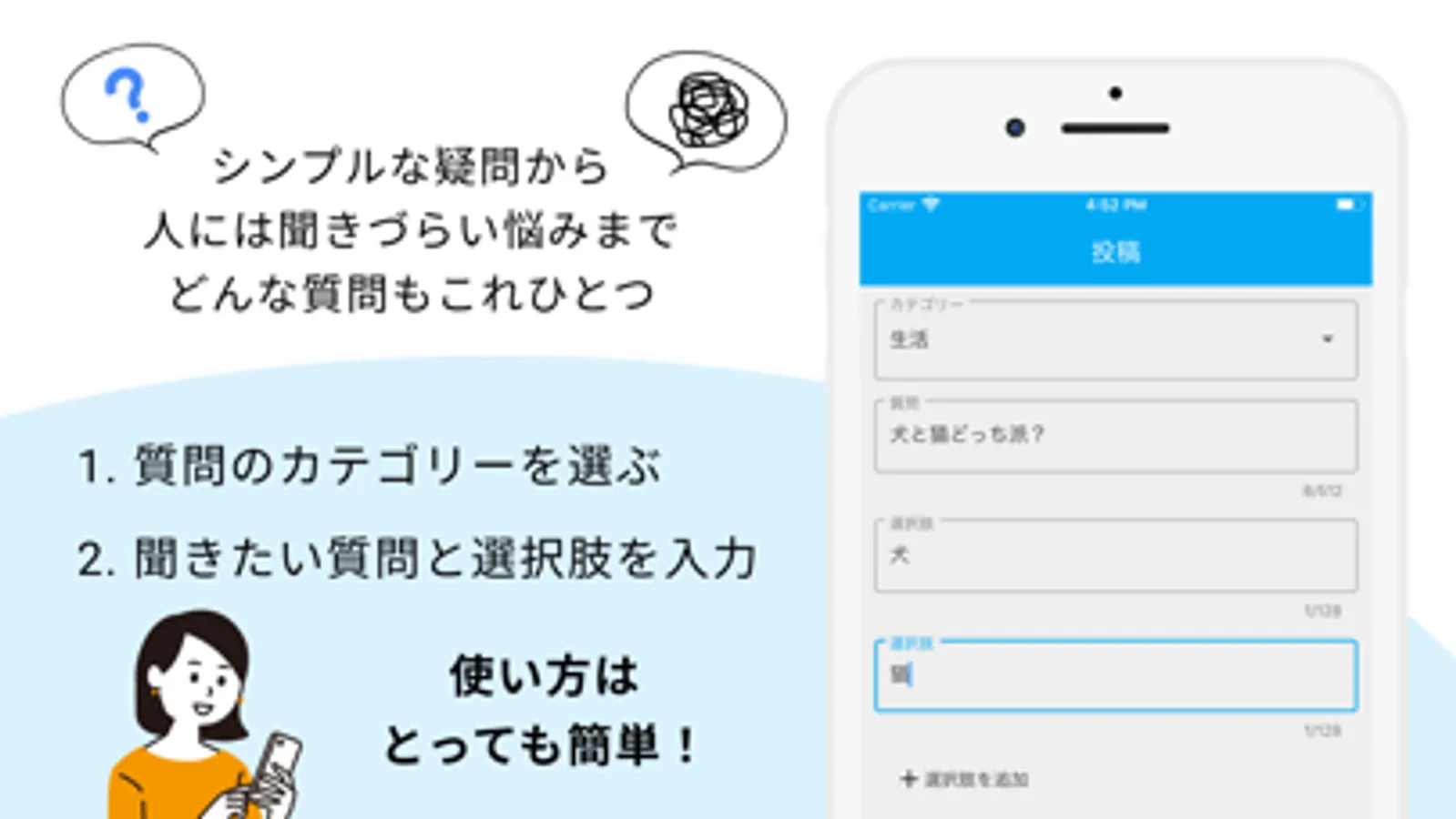Getting started with the app is very simple. You just post a question with 2 - 5 choices. Once that is done, other users of the app will answer your question. You will receive push notifications when your question gains some number of answers so you won't miss the result.