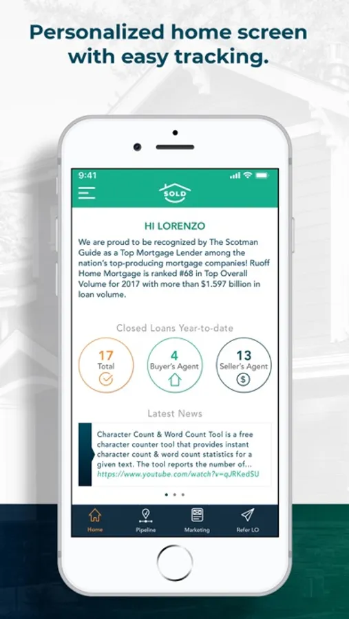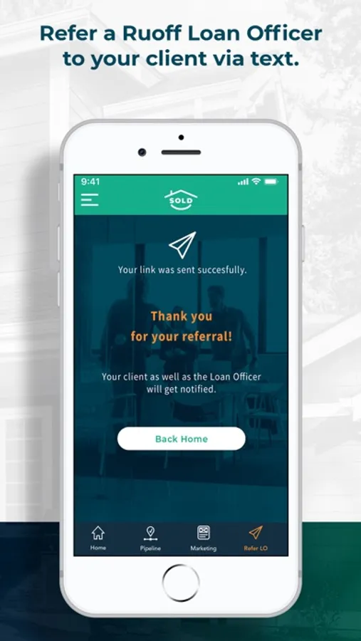Ruoff Agent is built for any selling or listing real estate agent involved in an transaction financed by Ruoff Home Mortgage. This app provides a central hub for the agent to track status of active and closed transactions, examine marketing materials provided by Ruoff Home Mortgage and connect potential clients with Ruoff Home Mortgage loan officers. Downloading this app also ensures the agent will have real-time push notification updates on their phone when customers pass a key mortgage milestone. Highlights include:
