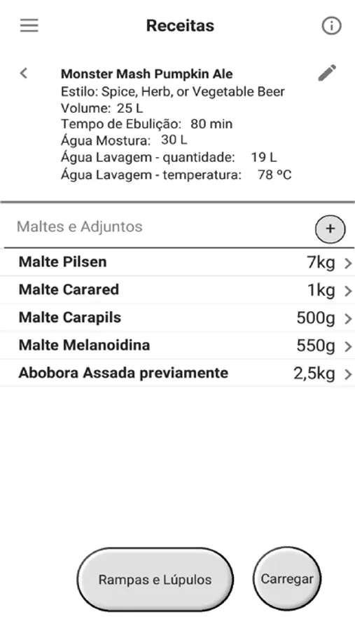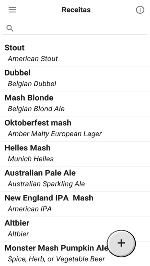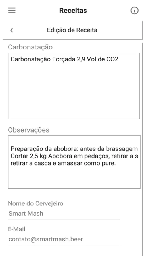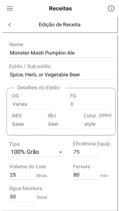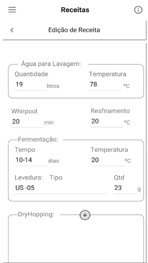 * Armazene as receitas indicando o estilo, volume, tempo de fervura, água de lavagem, fermentação, dry hopping, maturação, carbonatação, entre outros;
