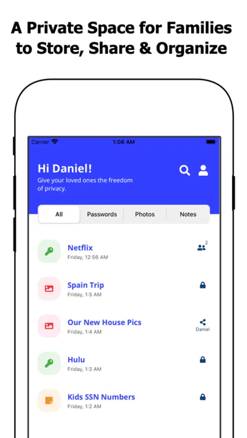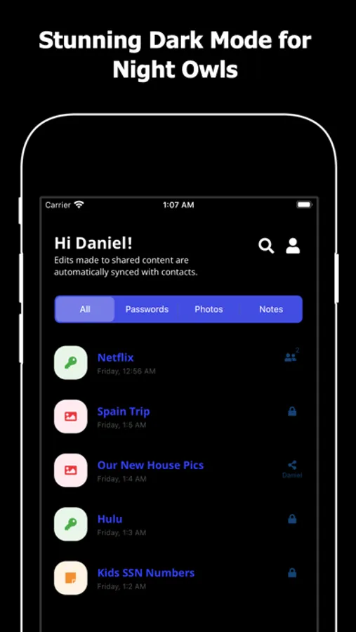 Once shared, any updates you make to your passwords, photos or notes are automatically synced with your family members so they always have the most updated information at all times.