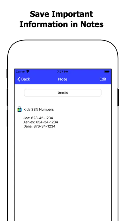 Save Kids SSN numbers, account numbers, gate codes, private thoughts or more in notes.