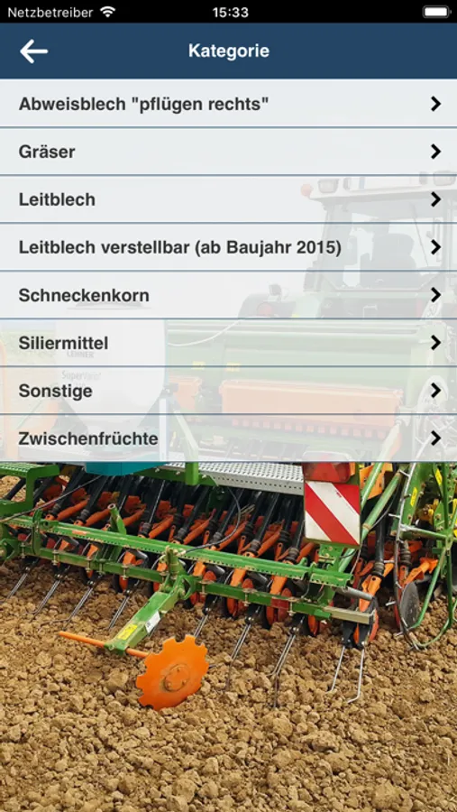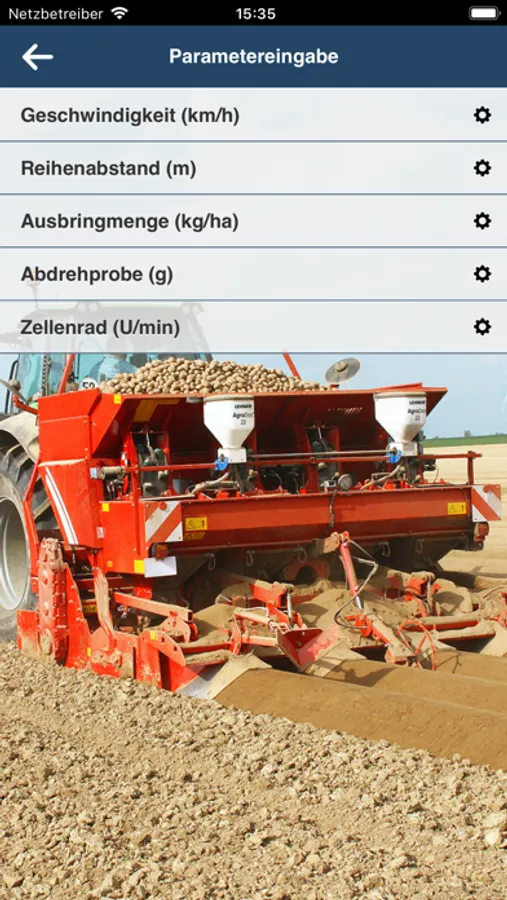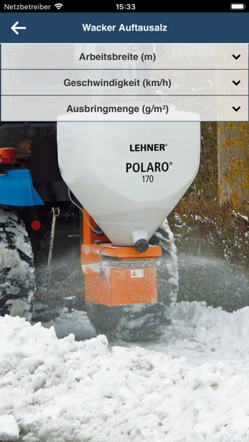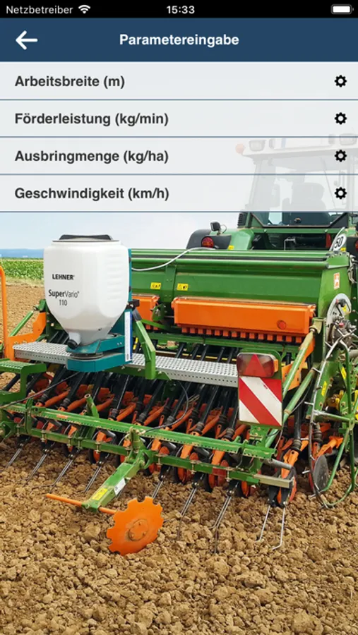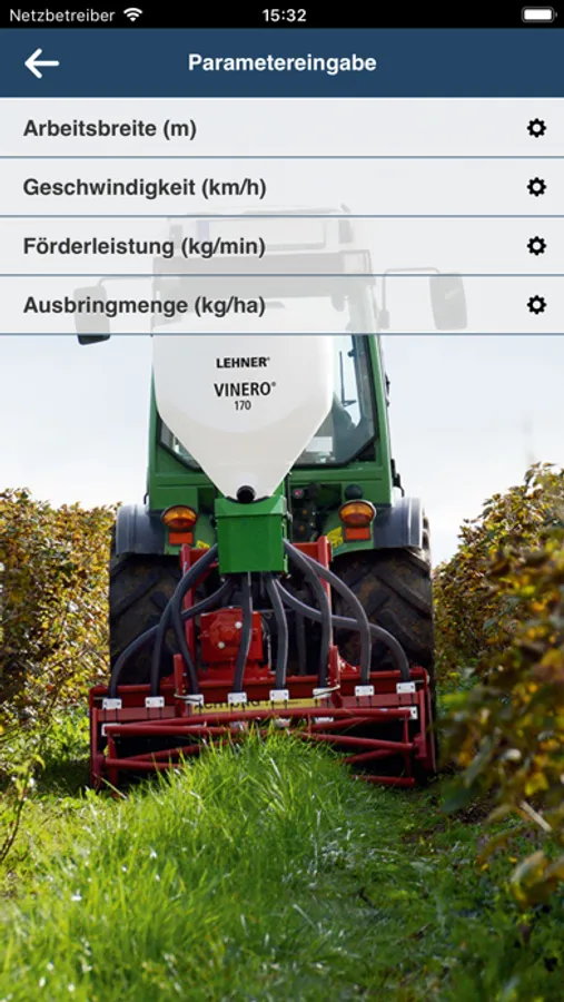 You select the granulate you wish to apply, then enter the spreading rate, speed and working width and the app will show you the required setting for your LEHNER spreader.