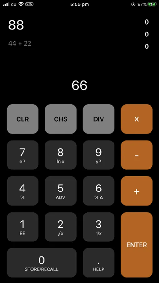This is my artistic interpretation of the ideal form for a calculator, taking inspiration from the standard Apple iPhone calculator. Make sure to spend a few minutes to get the hang of the calculator and also read the short help guide (accessed by a long press on the help button) to get the most out of it.