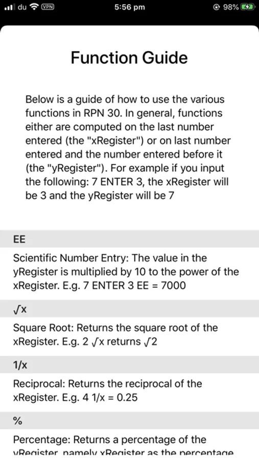 Reverse Polish Notation ("RPN") is an alternative way to complete calculations. Many find it to be more intuitive and user-friendly than the "normal" way of using a calculator. RPN works entering numbers first and then the operator (i.e. 53 47 + will give you 53 + 47 = 100).
