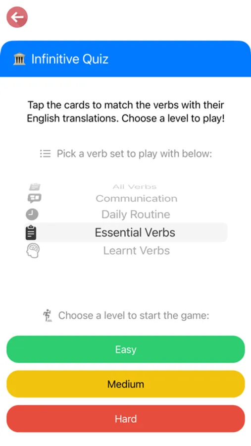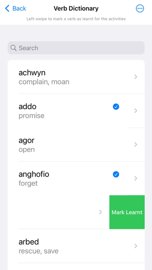 As well as a handy verb reference section where you can read and hear the Welsh conjugations (internet connection required for narration), there is plenty of practice provided with a set of intensive verb drill activities to quiz your conjugation knowledge. Activities include: