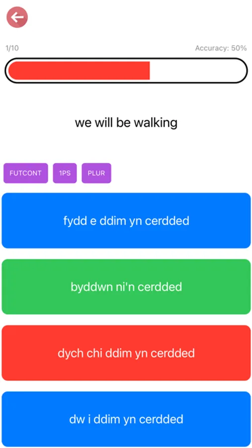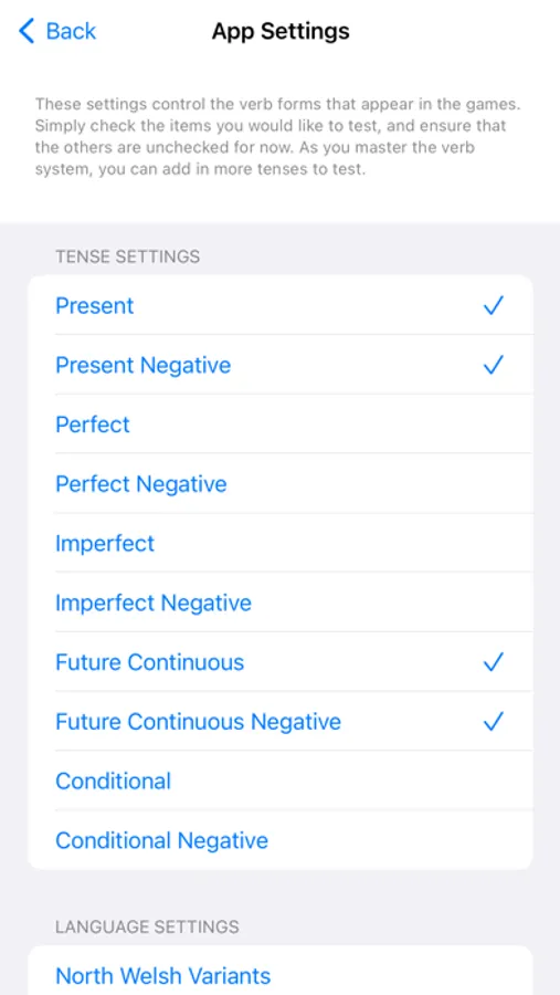 In the settings, you can select which tenses to drill in the games. So whether you are a complete beginner, or already a little way along your journey to Welsh mastery, there is a level for you!