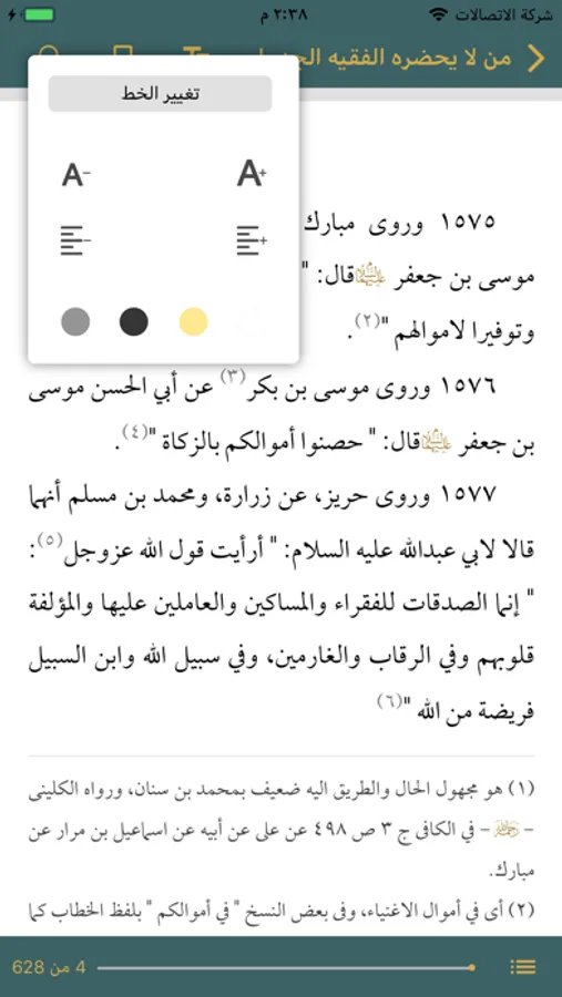 ٥ـ إمكانية تغيير الخط وحجمه، وفاصلة الأسطر، وخليفة الشاشة والإضاءة.