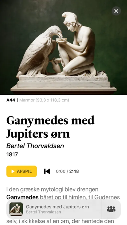Thorvaldsens Museum tilbyder spændende indhold omkring museet og de løbende udstillinger. Som besøgende kan du læse mere omkring værkerne eller lytte til lydguides. Hvis du besøger museet sammen med andre kan du benytte dig af Samlyt, som sørger for at du kan lytte til lydguides samtidig.