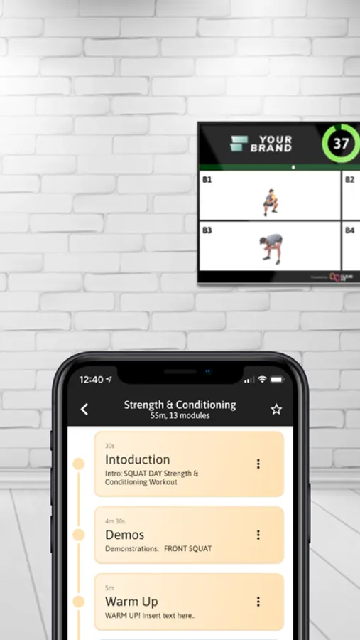 Workout builder: build your workouts quickly and seamlessly using our flexible workout builder. Our system provides limitless possibilities from a straightforward circuit workout, to AMRAP and EMOM styles, warm ups & cool downs, demos or try out our digital whiteboard to display anything you want.
