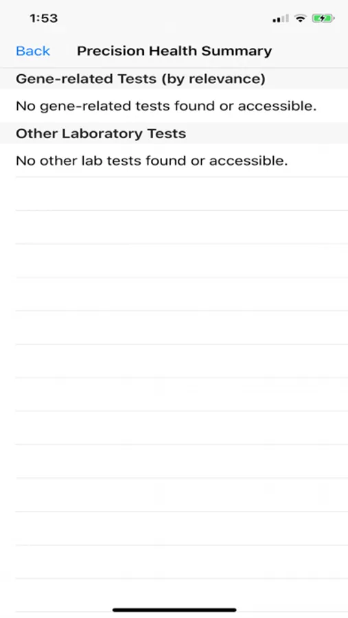 Precision Medicine involves the integration and analysis of your clinical and genomic data, now enabled by Apple’s HealthKit and Health Records initiatives. There are estimated to be roughly 20,000 to 40,000 genes in the human genome, with many genes potentially impacting a person’s health. Your Health Records may contain many different laboratory test results, including some about particular genes relevant to your health. However, manually searching ALL health records for useful laboratory results can be very time-consuming. Our app takes care of that by automating this process specifically for gene-related laboratory test results.