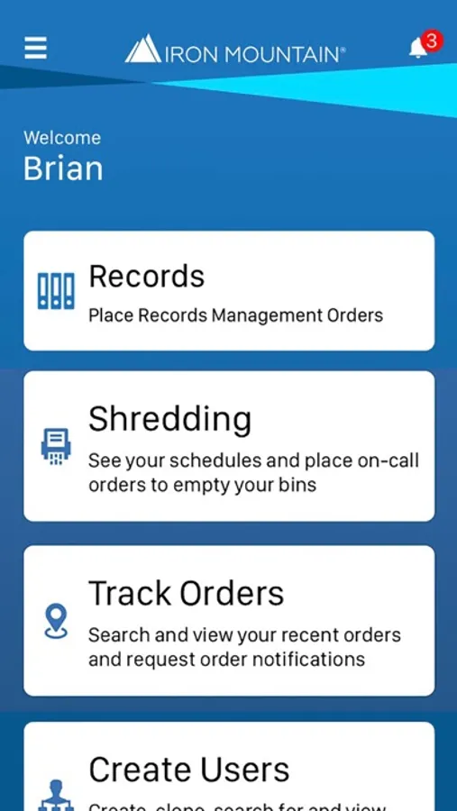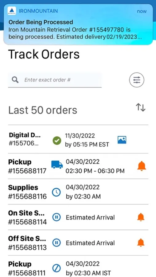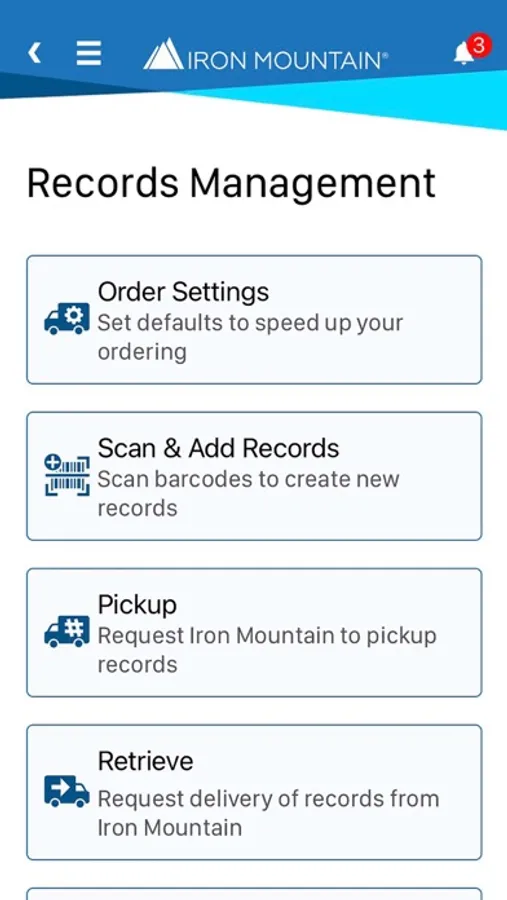 Managing records is part of your job and you need to find information fast. Iron Mountain® Mobile is your time-saving, secure way to schedule and view orders (pickups, retrievals, IODs, supplies), and track deliveries “on the go” from your mobile phone or device.
