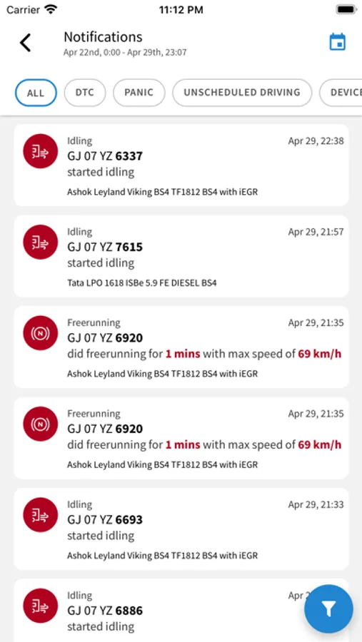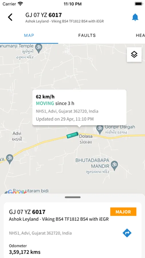 - Map View with Live Location along with Vehicle Speed and positioning details