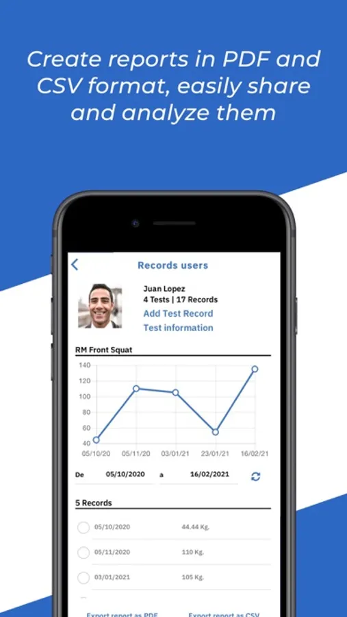 Imagine being able to easily generate reports of all kinds. Testing lets you make reports of a specific athlete, test, category, date... You decide! In addition, we offer you the option of creating a CSV file to export your data onto a spreadsheet or as a PDF that you can send by email, WhatsApp... You choose!
