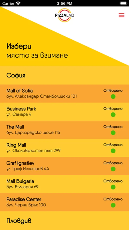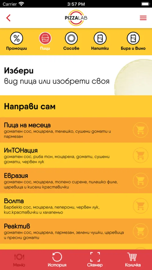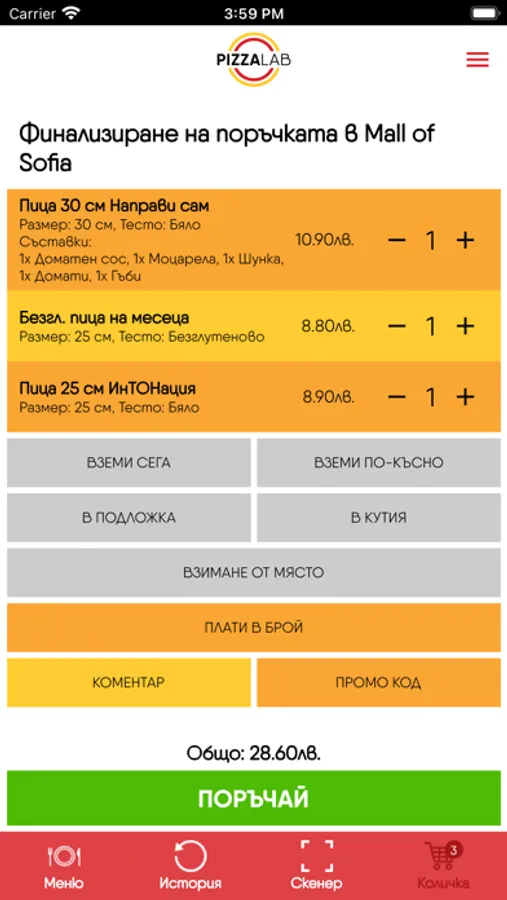 With our app you place an order in just a few clicks and then collect everything ready from the chosen PIZZALAB!