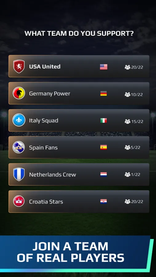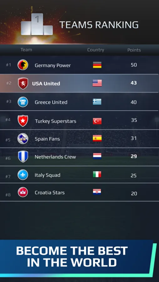 Find and team up with people from your country to support your national soccer team! Lots of friends that love soccer games just like you do are waiting for you. Who knows, maybe those friendships that you will start in Football Rivals can transform into real ones, and you will have new mates to go to real soccer games with!