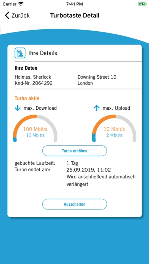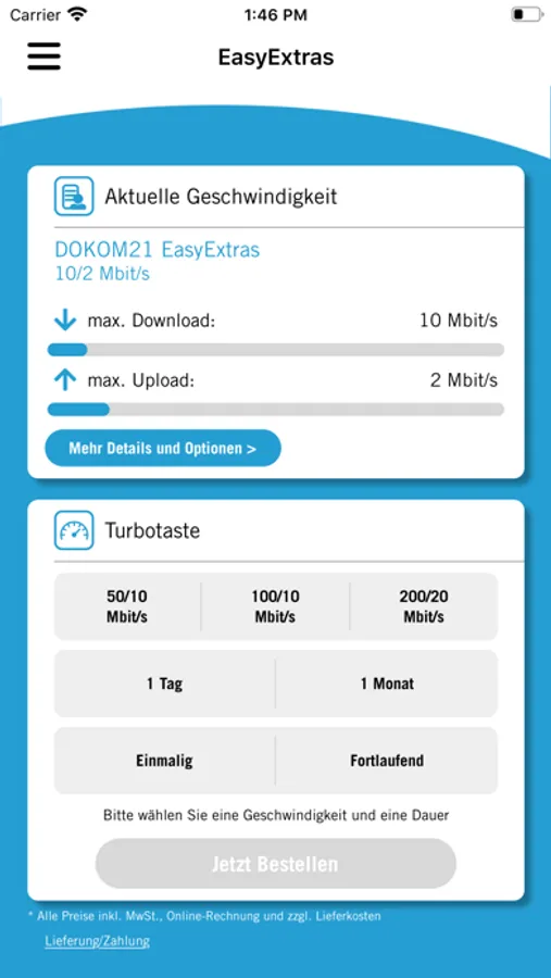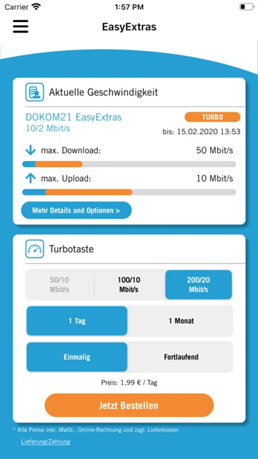 Über unsere App aktivieren Sie Ihre Internet-Flatrate mit bis zu 10 Mbit/s im Down- und bis zu 2 Mbit/s im Upload und buchen bei Bedarf einfach mehr Geschwindigkeit hinzu. Dabei entscheiden Sie selbst, ob Sie nur für einen Tag oder für einen Monat mit 50/10 Mbits, 100/10 Mbit/s oder sogar 200/20 Mbit/s im Netz unterwegs sein möchten.