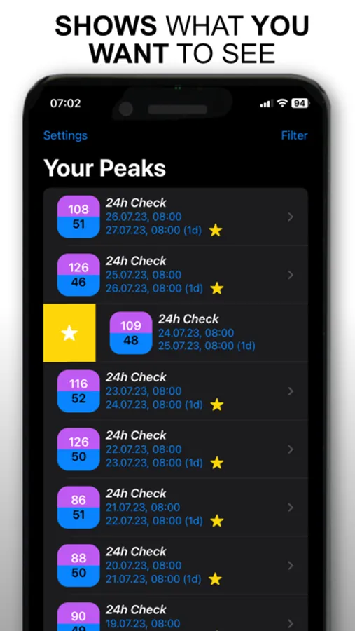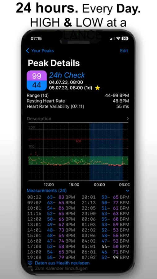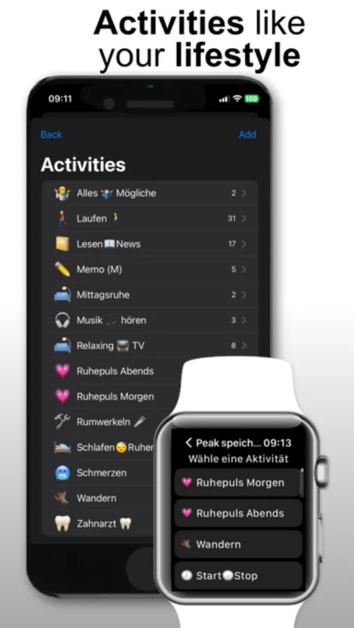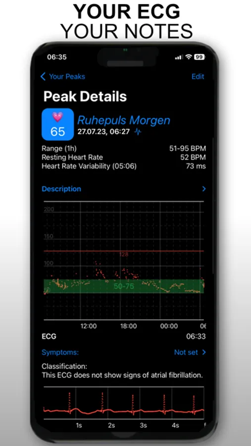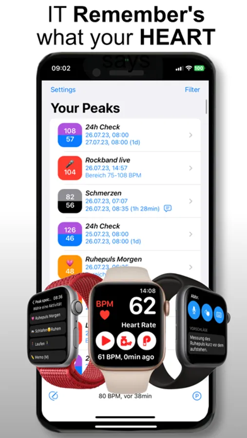 Create your own activities, specially tailored to you for every life situation, with an unmistakable personal description. Heart Peaks History informs you with notifications on your watch or your iPhone when a threshold value has been exceeded or fallen below. With the help of the Heart Peak History App, conclusions about a possible illness can possibly be recognized.