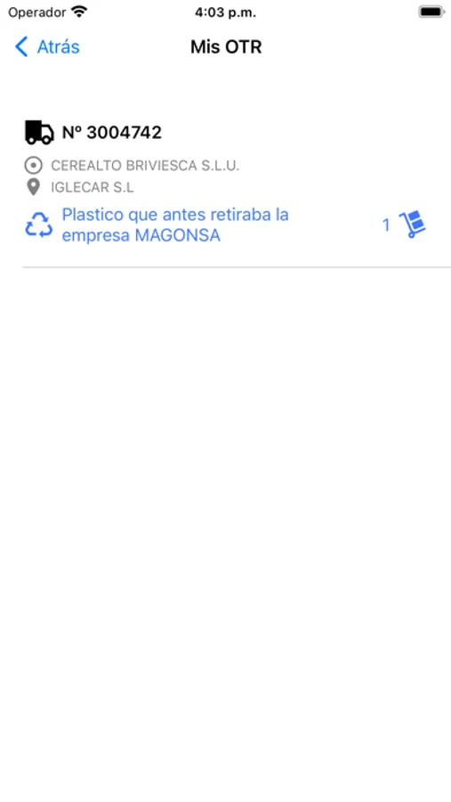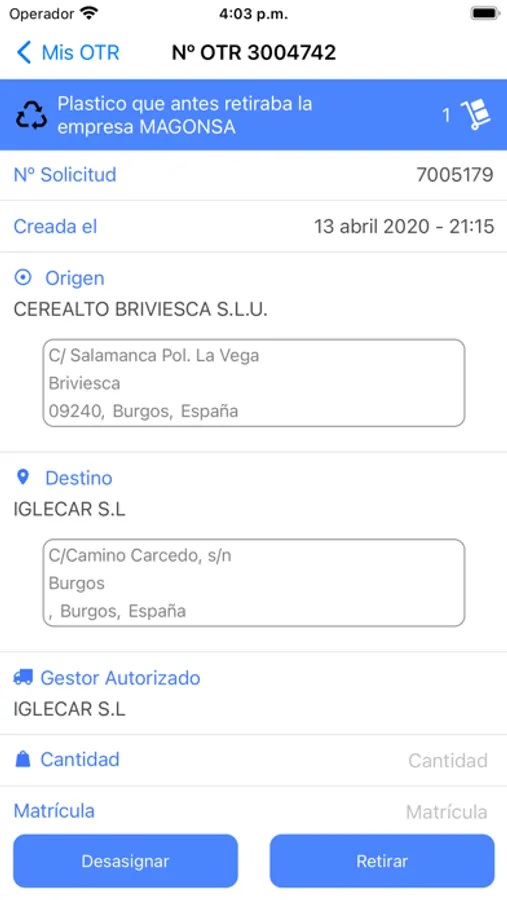 Aplicación para la gestión de órdenes de traslado de residuos y productos dentro del sistema FAMA AFM.