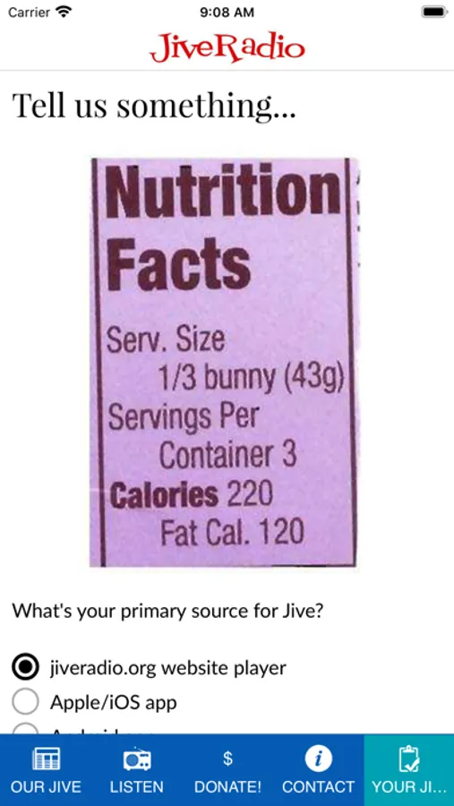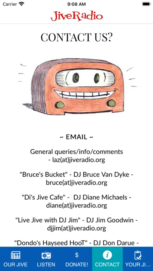 App provides stream access to the JiveRadio.org feed with track info & album art (when available), the all-important donor link and contact info.