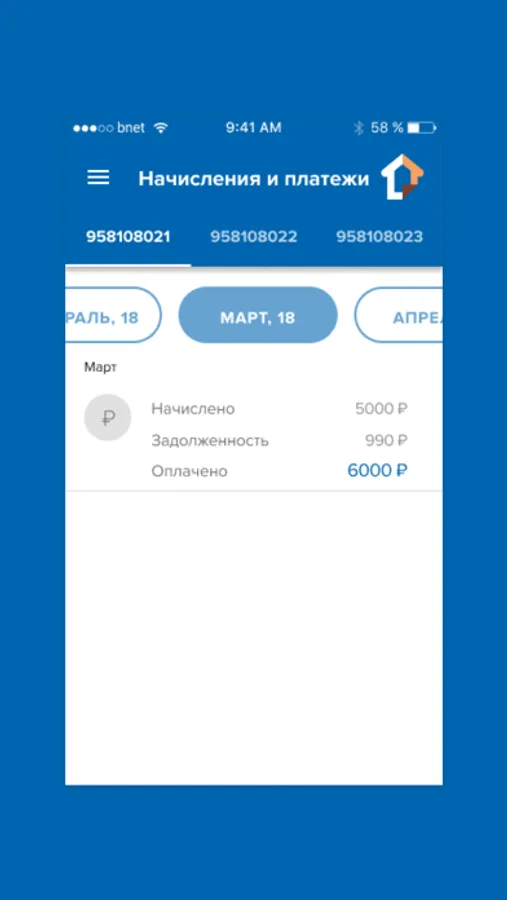 «Мой Дом» позволяет работать с несколькими лицевыми счетами, подключение которых происходит мгновенно, после подтверждения номера лицевого счета кодом из последней квитанции.