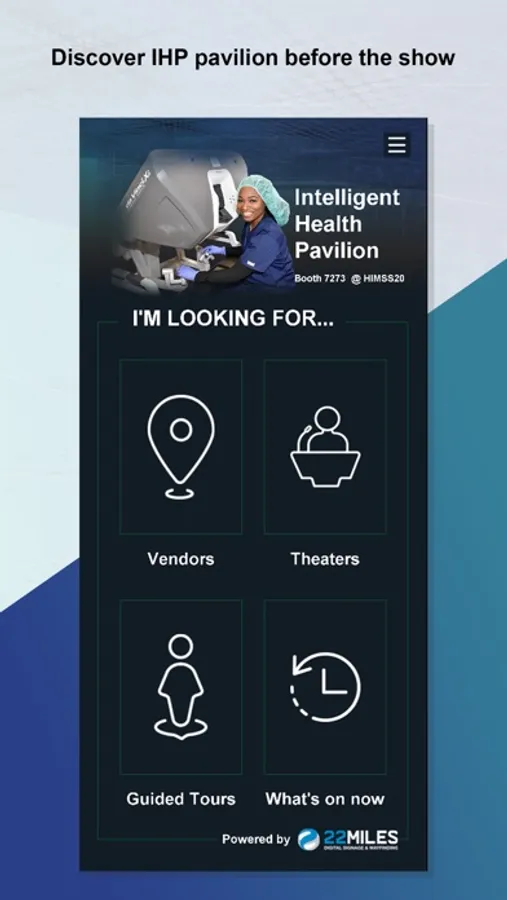 The IHP Wayfinding App is offered to enhance your experience in this Destination Pavilion at HIMSS. Make the most of your visit and find out what's on in the two Pavilion theaters, the schedule for guided demo room tours, stories you will see demonstrated in the tours and who has a kiosk in the Pavilion.