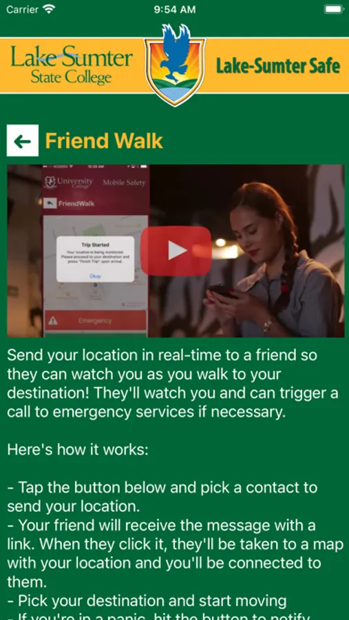 - Friend Walk: Send your location to a friend through email or SMS on your device. Once the friend accepts the Friend Walk request, the user picks their destination and their friend tracks their location in real time; they can keep an eye on them to make sure they make it safely to their destination.