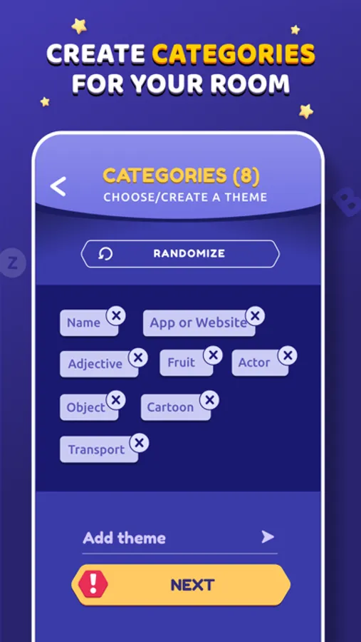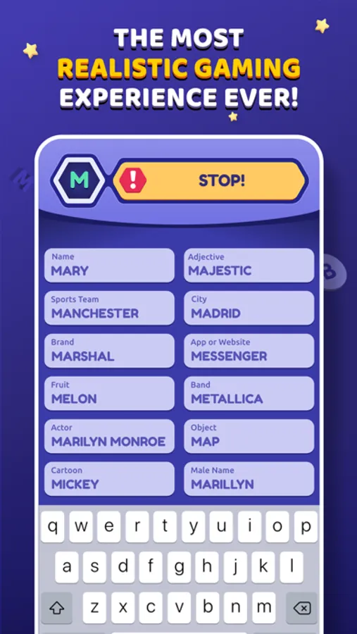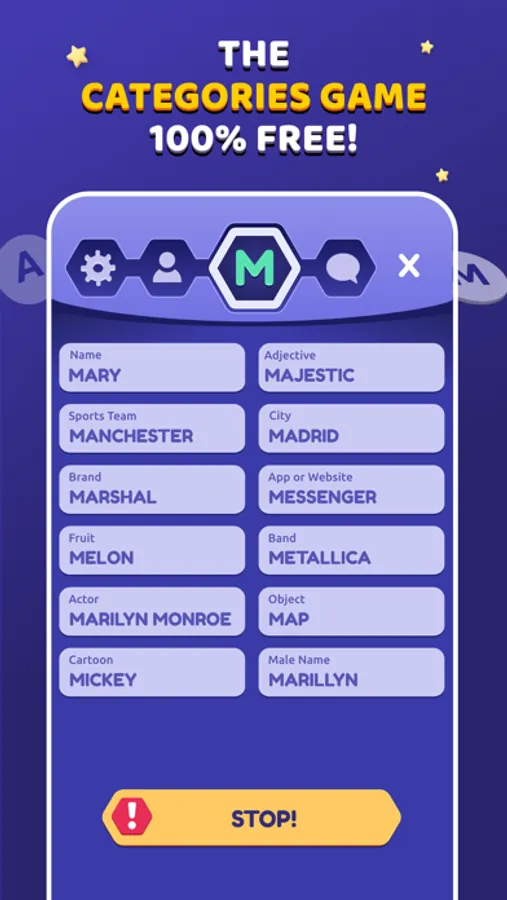 At the first moment, categories are chosen to serve as a base for the game dynamics. Categories like: Names, Animals, Objects and so on are examples of it. Once they're defined, a random letter is given to players, and a new turn begins. All must complete each category using a word that starts with a randomized letter. Those who fill all categories first press "STOP!" button; after that, all remaining players have their answers stopped immediately. By voting, players analyze all the answers and verify if they're valid or not. 10 points are added for each acceptable answer, 5 for repeated answers, and none for bad ones. This process repeats until a limit round is reached.repeated answers and none for bad ones. This process repeats until a limit round is reached.