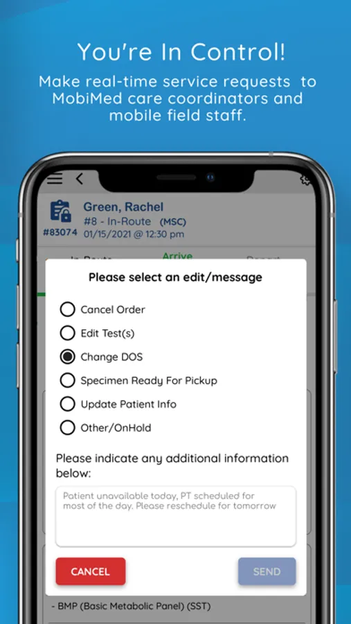 * Modify or delete your orders, such as change date of service, cancel order, indicate specimen is ready for pickup, and more (no need for lengthy phone calls)