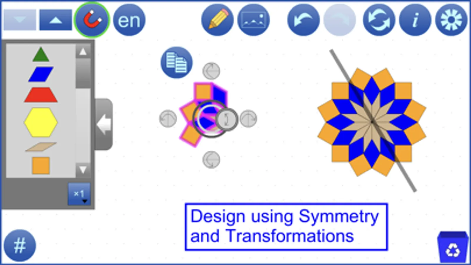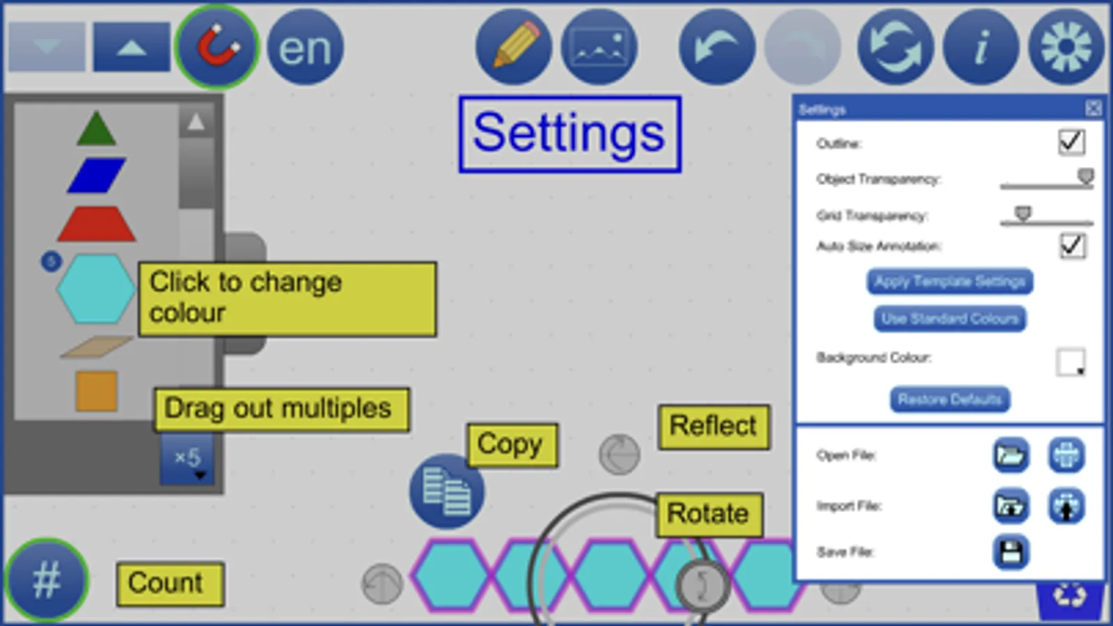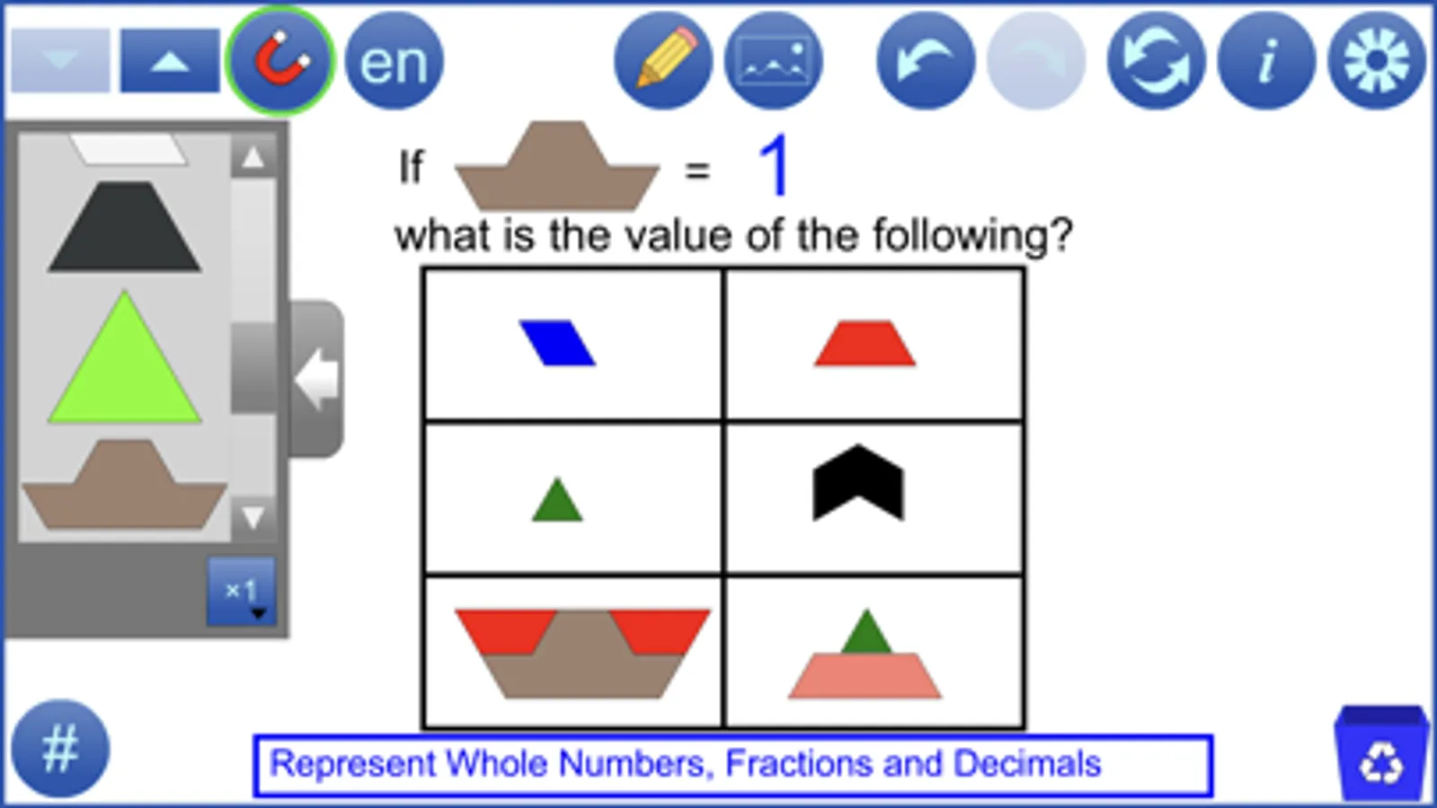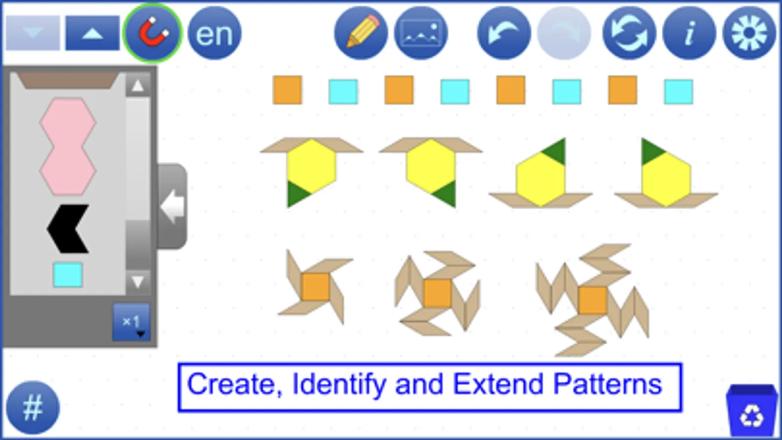 The Pattern Blocks+ Tool is a virtual manipulative similar to the physical ones commonly available in classrooms. Fifteen different shapes can be dragged into the workspace from the scrollable selection panel at the left. Once in the workspace they can be moved, copied, reflected, or rotated, individually or in groups. Blocks to represent tenths are included. The colour of each type of block can be changed. Blocks can be used to create designs and develop numerous mathematical concepts.