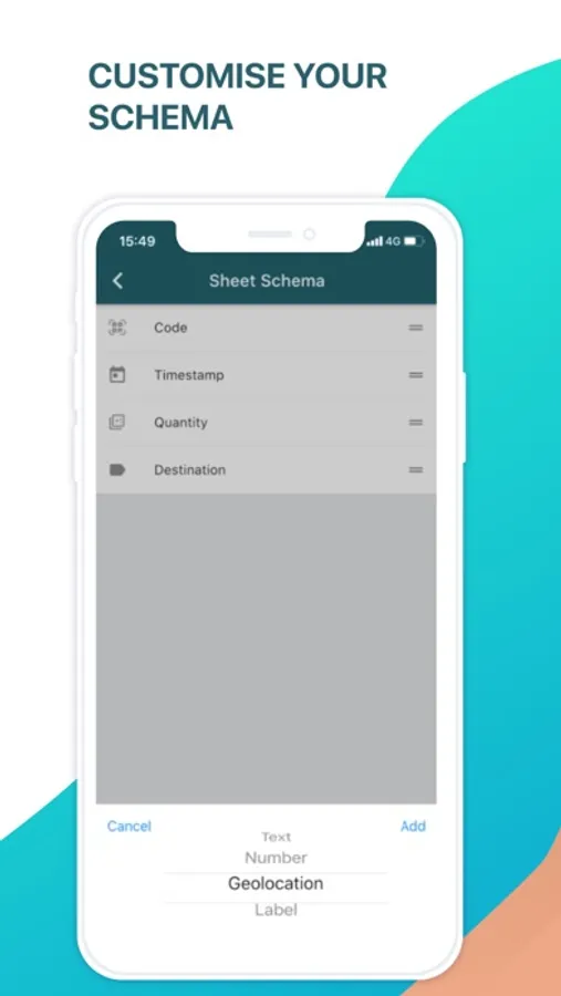 You can customise your schema to append geolocations, timestamps, quantities, and custom text and numeric fields and labels to your scans.