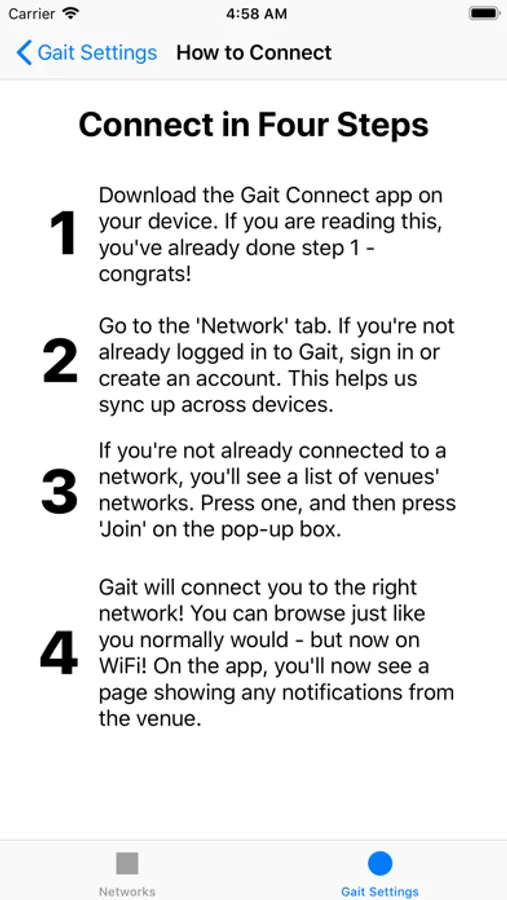 Gait Connect automatically connects your device to pre-approved wireless networks, so you can stay connected wherever you go. We partner with various venues (coffee shops, restaurants, shops, etc...) for WiFi so you can stop using up your costly data.