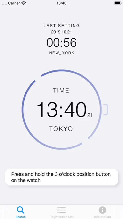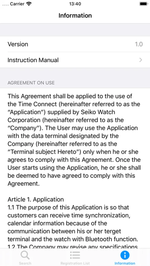 Application for time correction watch.By connecting the watch, via this Time Connect application (hereinafter this “App”), with a smartphone installed with this App (hereinafter the ”Smartphone”), the watch receives the time information automatically from the Smartphone to correct the time.The watch can also receive the time data manually by operating the buttons.