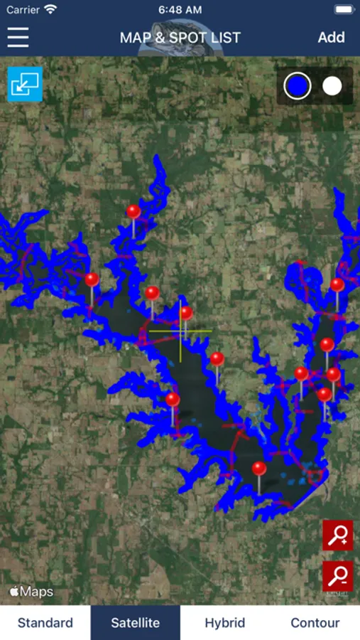 - Native Apple Map with overlay of underwater roadbeds, ponds, ruins, and ramps on Lake Fork.