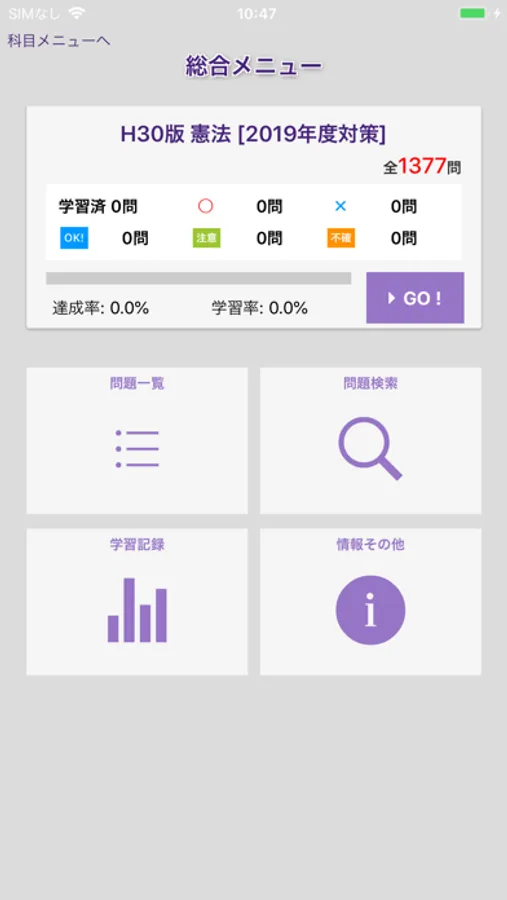 無料アプリではH30年度の憲法から30問、民法1・2から30問、刑法から30問の計90問を収録しています。その 90肢でも機能は有料コンテンツ使用時と同等ですので、本製品の使用感をお試しいただけます。