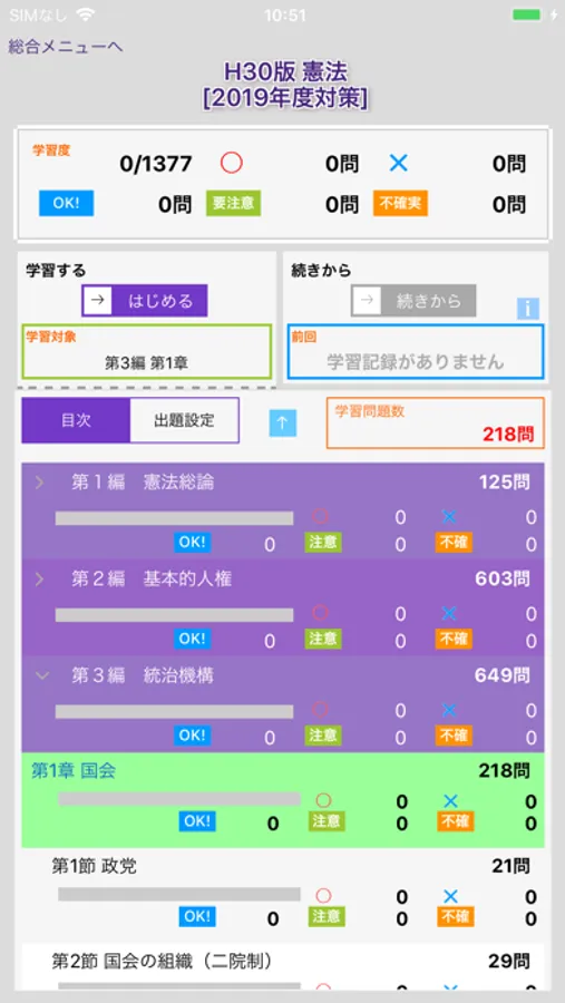 デフォルトでは標準的な体系に従って問題を配列してあります。代表的な教科書を読み進めながら、節目ごとに当アプリで肢別に知識チェックしていけば、メリハリのある実戦的学習が可能になります。もちろん、出題順をランダムに設定することも自由にできます。