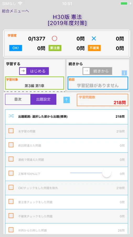 未学習、正解率、判例、チェックマーク等14種類の出題設定を用意。全て複合的に設定できるので、苦手な問題に素早く到達できます。