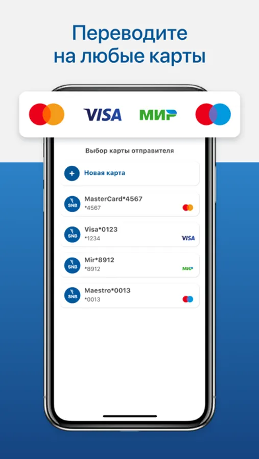 В приложении «СНБ Переводы» можно перевести деньги с карты на карту в следующих направлениях: