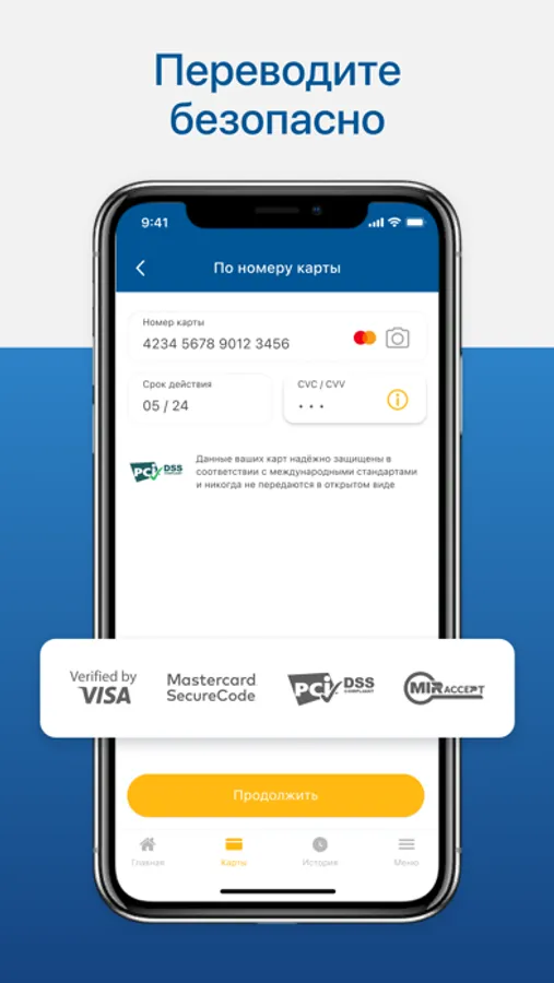 Переводы между картами защищены по технологии 3-D Secure - дополнительная степень безопасности.