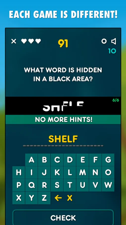 There will be an English word hidden on the screen. Try to guess the word. if you are not sure, you have 6 hints available. Tap on the word to show more of it. Once you think you know the word, type it with a keyboard provided and tap on a Check button.