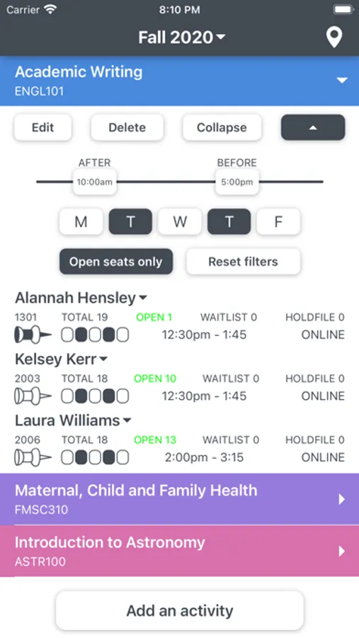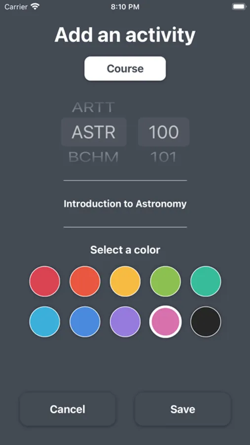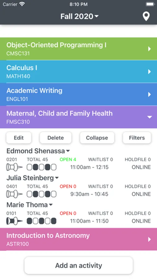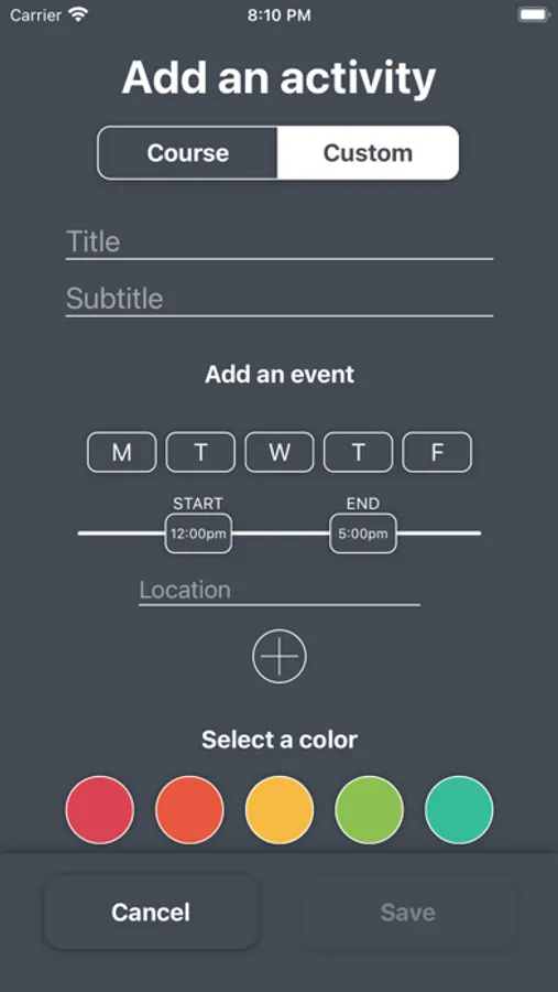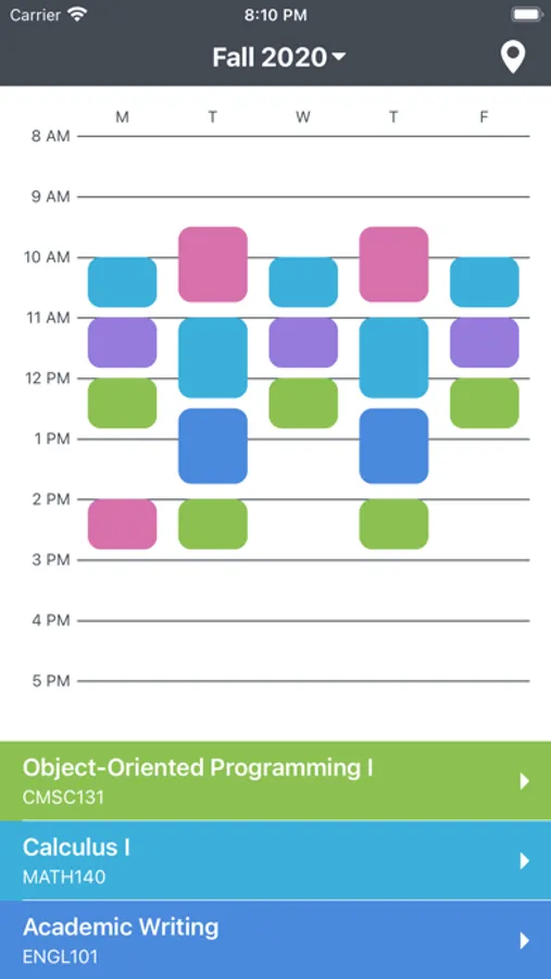 Plan and manage your weekly schedule in College Park with ease. Terp Schedule offers live, up to date course data directly from the University of Maryland's schedule of classes, while also allowing users to create their own custom activities.