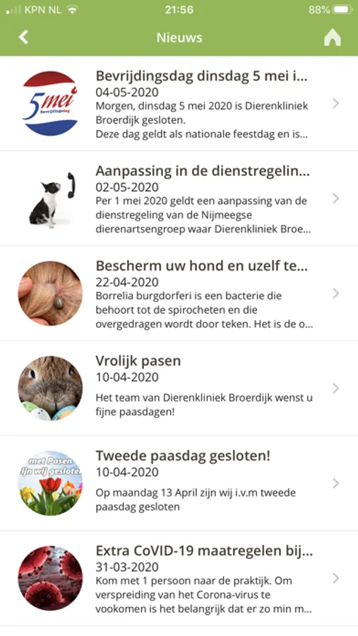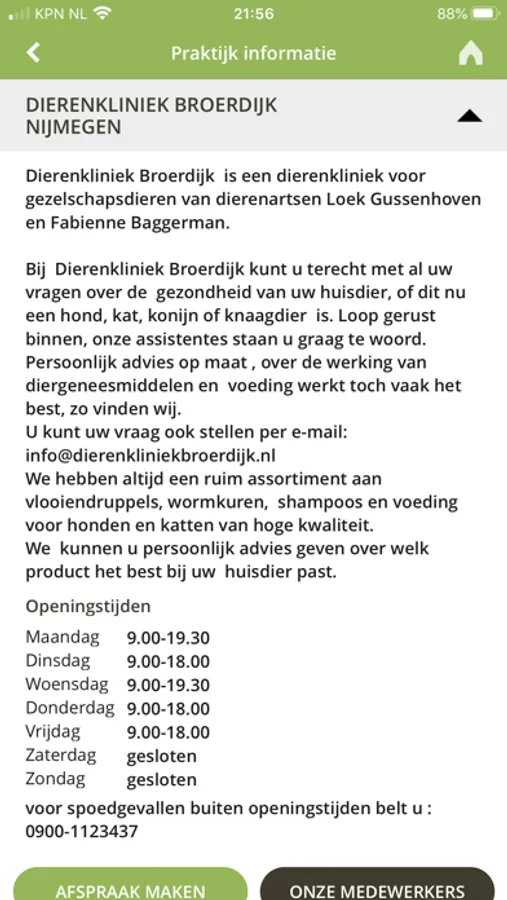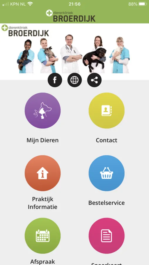 De app van Dierenkliniek Broerdijk is een gratis app ontwikkeld dóór dierenartsen. Met deze app kunt u alle gegevens van uw huisdieren op 1 plek overzichtelijk bijhouden, gegevens als: - Naam - Geboortedatum - Geslacht - Chipnummer - Vaccinaties - Wormkuren - Vlooienbehandeling - Verzekering - Etc. Direct CONTACT met uw dierenarts. De app van Dierenkliniek Broerdijk app is een app met het doel het contact tussen de diereigenaar en haar dierenarts te bevorderen. Zondagavond op de bank, u bedenkt ineens dat het dieetvoer of de medicijnen voor uw hond op raken: binnen 5 seconden heeft u deze bij uw dierenarts besteld met deze app! Een herinnering voor de vaccinatie, een afspraak aanvragen, openingstijden en medewerkers bekijken, nieuws van uw dierenarts ontvangen: deze app helpt u hier allemaal bij. Ook te gebruikers zonder dierenarts koppeling U kunt in de app opzoeken of uw dierenarts deelnemer is aan MijnDierenartspraktijkApp. Indien dit het geval is kunt u een koppeling maken door uw dierenarts aan te klikken: u kunt nu gegevens met elkaar uitwisselen. Is uw dierenarts nog geen deelnemer, dan kunt u hen op de app attenderen. Ook als uw dierenarts nog geen deelnemer is kunt u gratis deze app gebruiken, zo kunt u alle gegevens van uw dieren invullen.