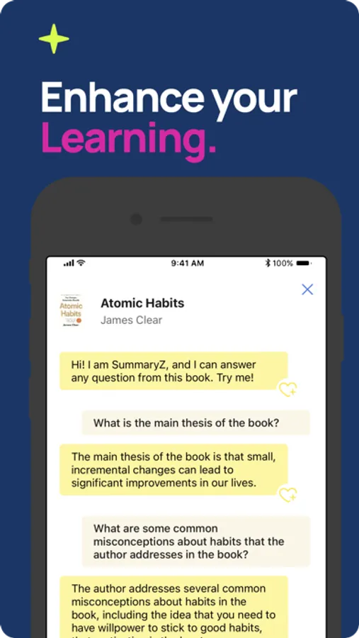 Get ready for an extraordinary reading experience with SummaryZ! Our latest feature, ChatBook, allows you to chat with any book in the world, enhancing your learning process like never before.