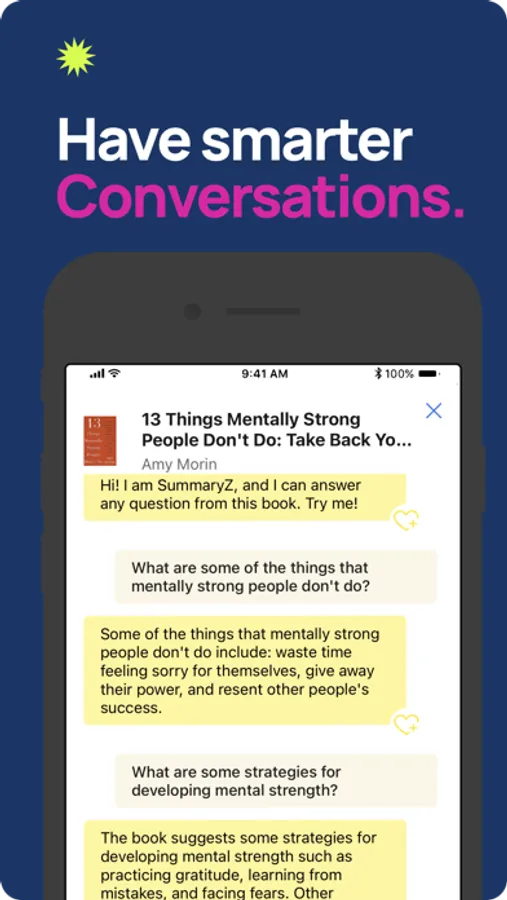 After you download the app, set up a challenge to read one book summary a day for 30 days. Reading or listening to one book summary from a book in SummaryZ takes just 10 minutes. It's easy, fun, and now with ChatBook, it's even more interactive and engaging!