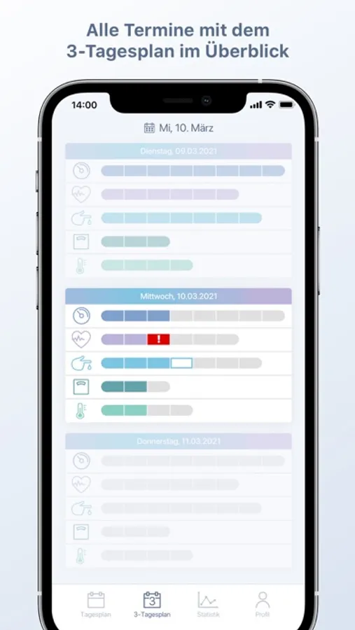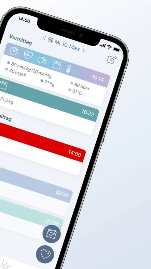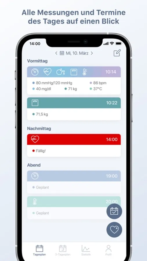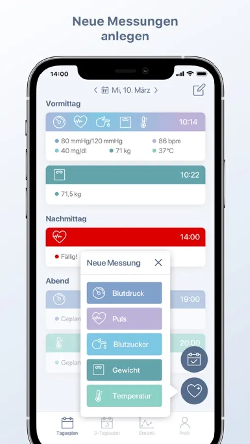 · VERPASSEN SIE KEINE MESSUNGEN: Der Tagesplan und der 3-Tagesplan geben Ihnen eine Übersicht über alle bevorstehenden und kürzlich durchgeführten Messungen. Erinnerungen lassen Sie keine geplante Messung mehr vergessen. MyHealthDiary benachrichtigt Sie rechtzeitig und informiert Sie darüber, welche Messung als nächstes ansteht.