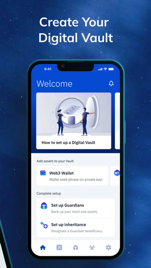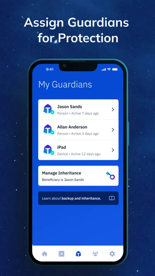 Assign trusted Guardians (friends, family, professionals, or devices) to protect your assets