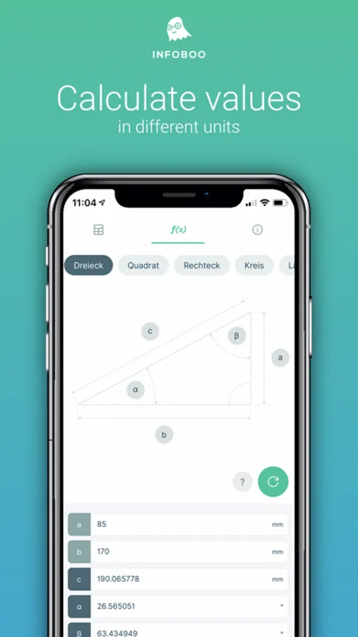 No formula book? No problem! We have already prepared various formulas for you in such a way that you only have to enter the values and can read the solution. Among them are calculations of angles, areas, distances and much more.
