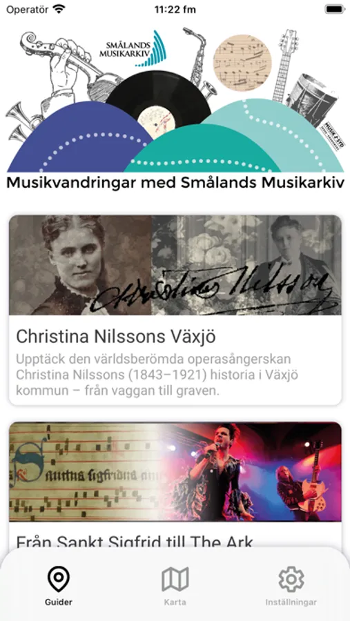 “Musical Walks with Småland’s Music Archive” leads you to various places of musical importance in the county of Kronoberg, Sweden. Discover Växjö’s rich music history from the 13th century and onwards, enjoy the local popular music in the region, or follow in the footsteps of the world-famous opera star Christina Nilsson (1843–1921). The musical walks, which are available in English and Swedish, present unique audio-visual material and knowledge. Download the app, follow the walks, listen, learn and enjoy!