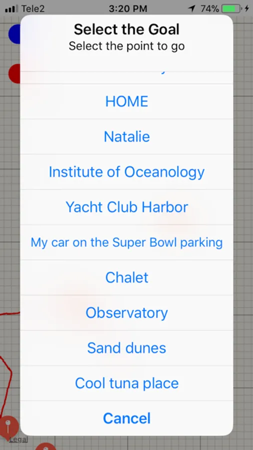 With the Internet running, a map of the location is visible. It is convenient to find the desired places on the map and by long pressing the screen to remember them. For example, "Home", "Camp", "Sand Dune", "Tuna bite place", "Club harbor", "My car in the Super Bowl parking." Then, in nature, without the Internet and maps, you can choose from the list the desired entered place and the navigator will lead you there.